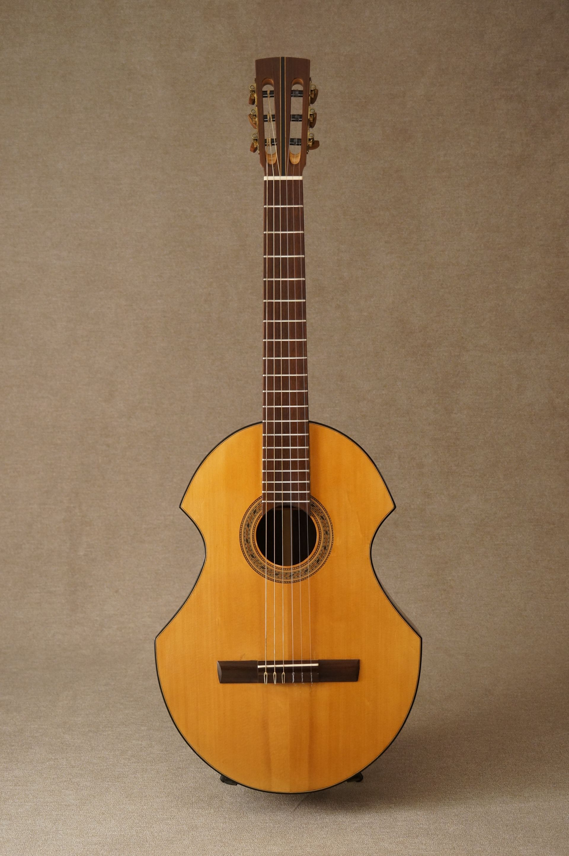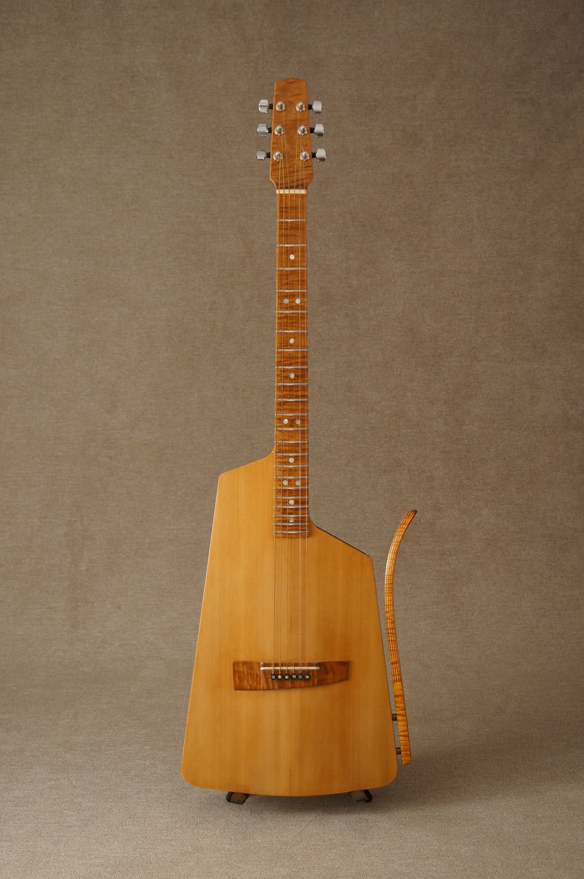 Fifty four years old, this was for me build No. 1, my first acoustic instrument, made in 1970. Hence the name Genesi. The shape came from a dream, but the guitar was only built after on a fluke I met a luthier–Jim (Doc) Pitman. He sold me an incredible German spruce soundboard (50 grains per inch) for $20, and then, well, the rest of my life followed.