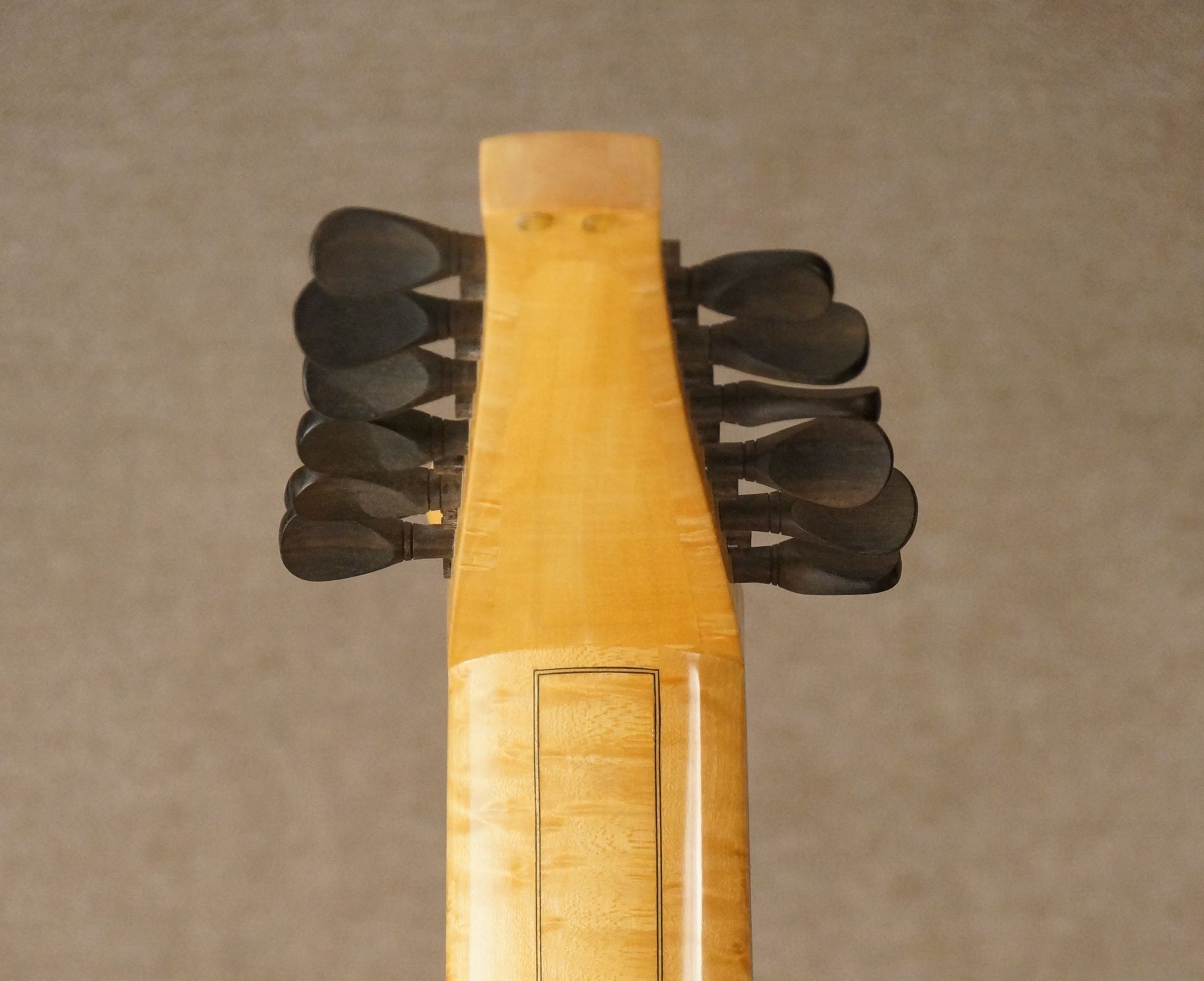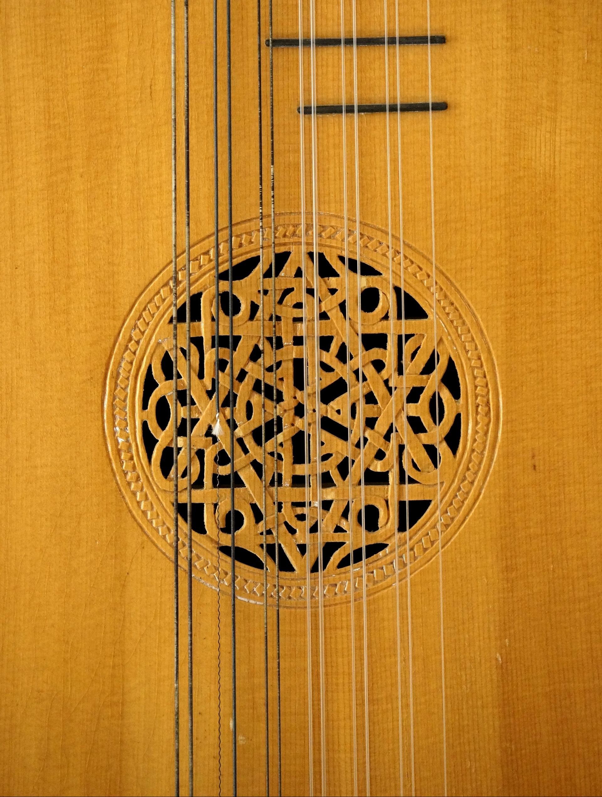 ButtonThe area carved into the soundhole is referred to as a "rose", in lute terminology. My challenge in designing this was to integrate a fourfold (cross) and a sixfold (star of David) geometric symetry in the design of the "knot". There is another well-known lute rose, named the "The Knot of Leonardo."