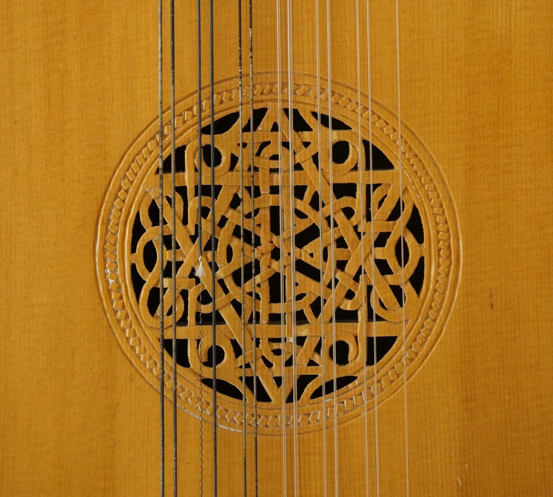 ButtonThe area carved into the soundhole is referred to as a "rose", in lute terminology. My challenge in designing this was to integrate a fourfold (cross) and a sixfold (star of David) geometric symetry in the design of the "knot". There is another well-known lute rose, named the "The Knot of Leonardo."