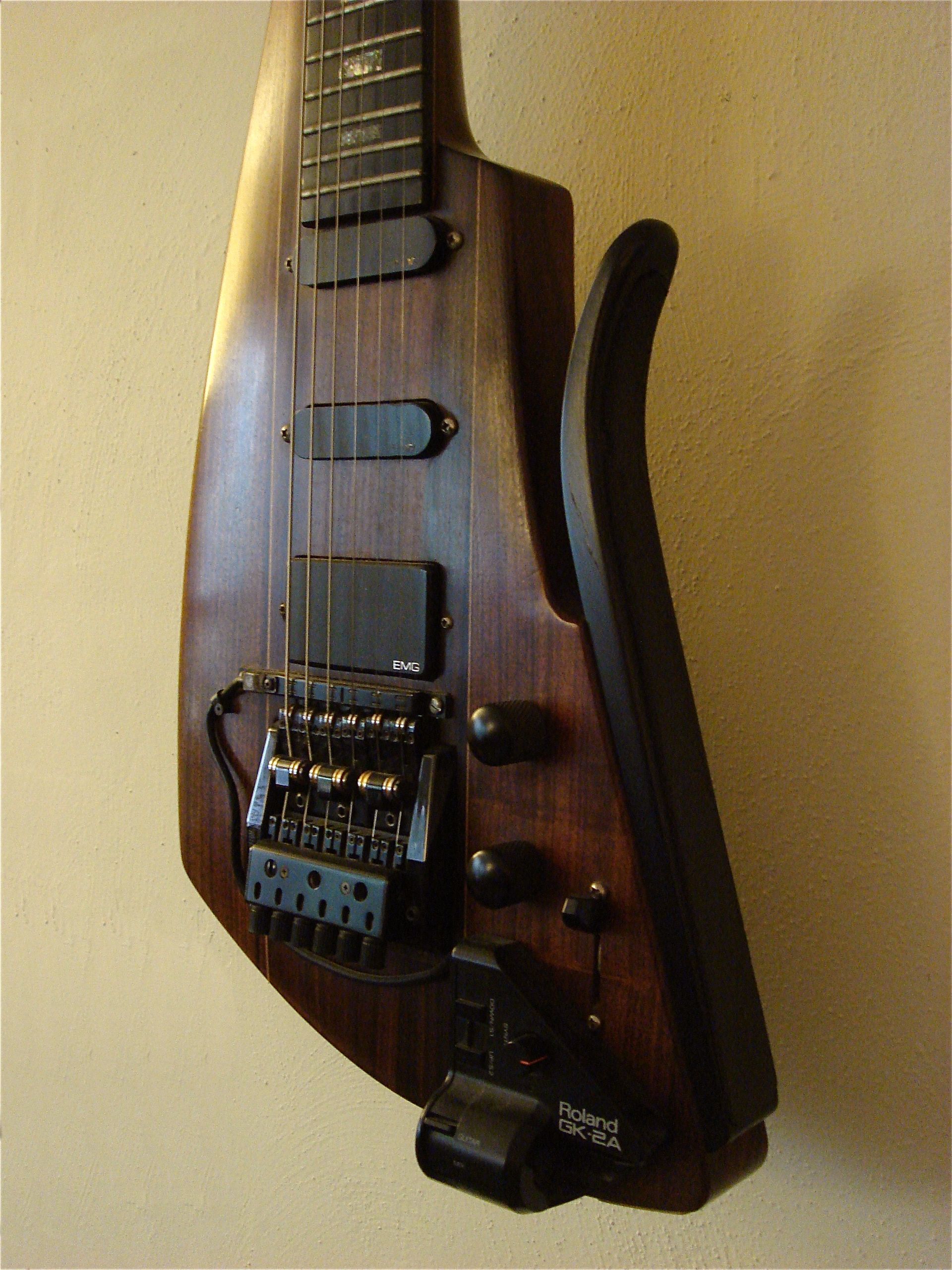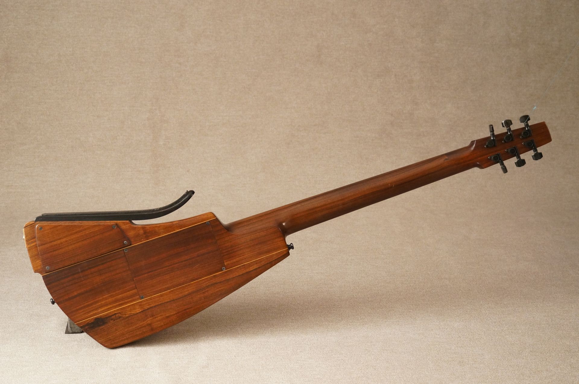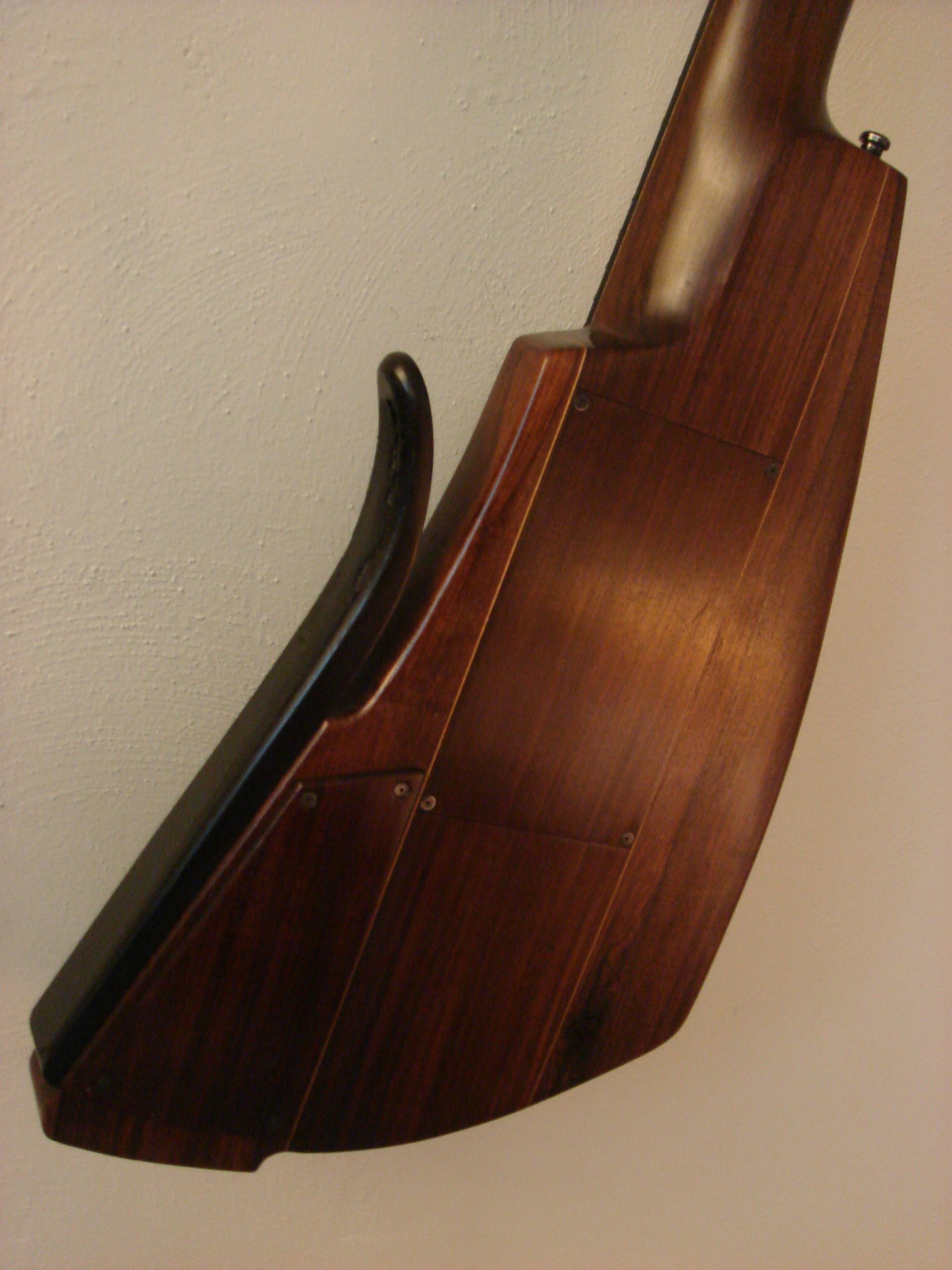 Built from a solid piece of Brazilian rosewood in 1985, the design was created to accommodate the original billet, which was around eighteen inches longer than the guitar. and only as wide as the center section. To build the body, that section was cut off and divided into two wedges, which were then laminated above and below the parallel veneer lines. And once again, form follows function and, in this case, material limits.