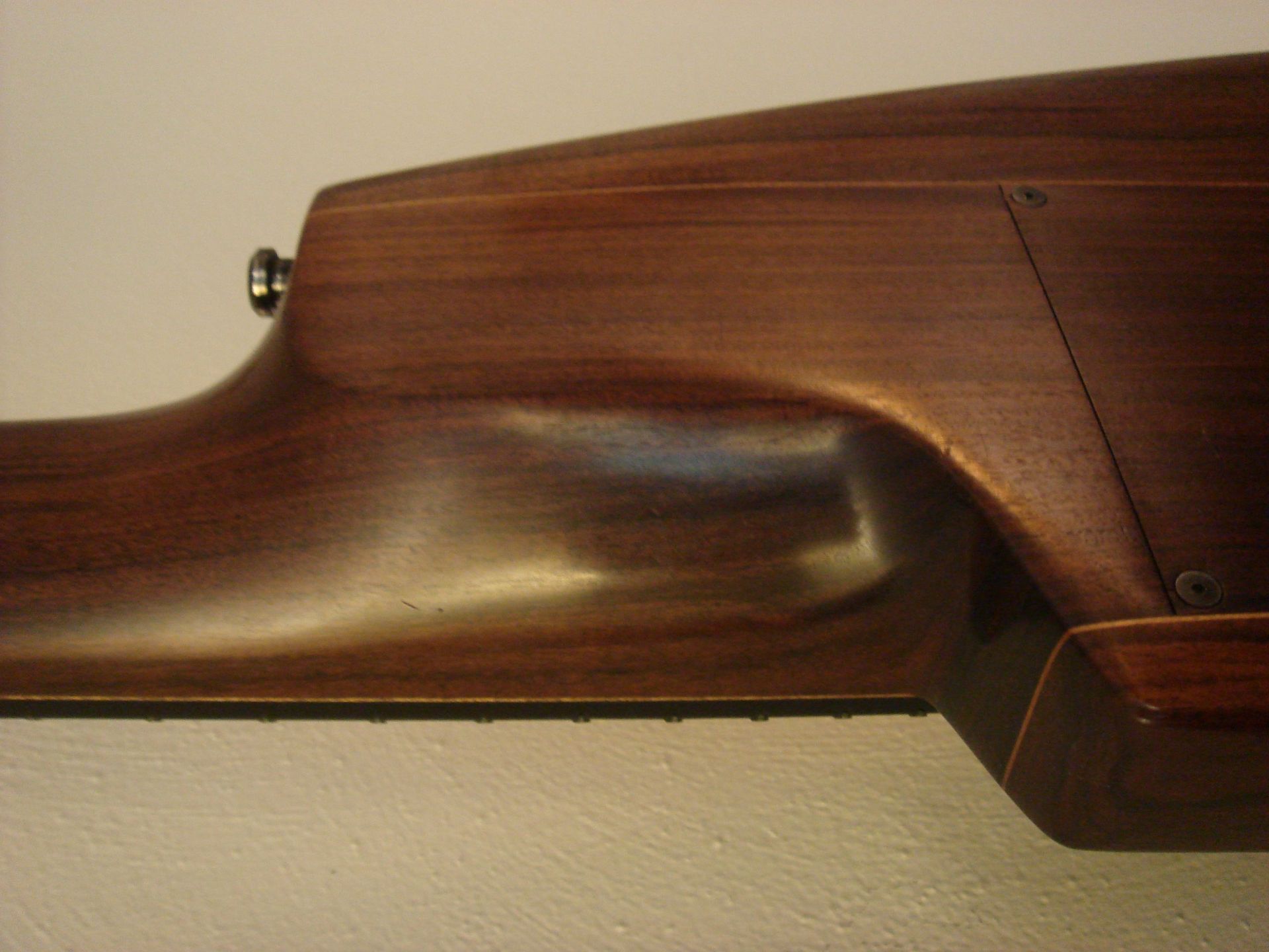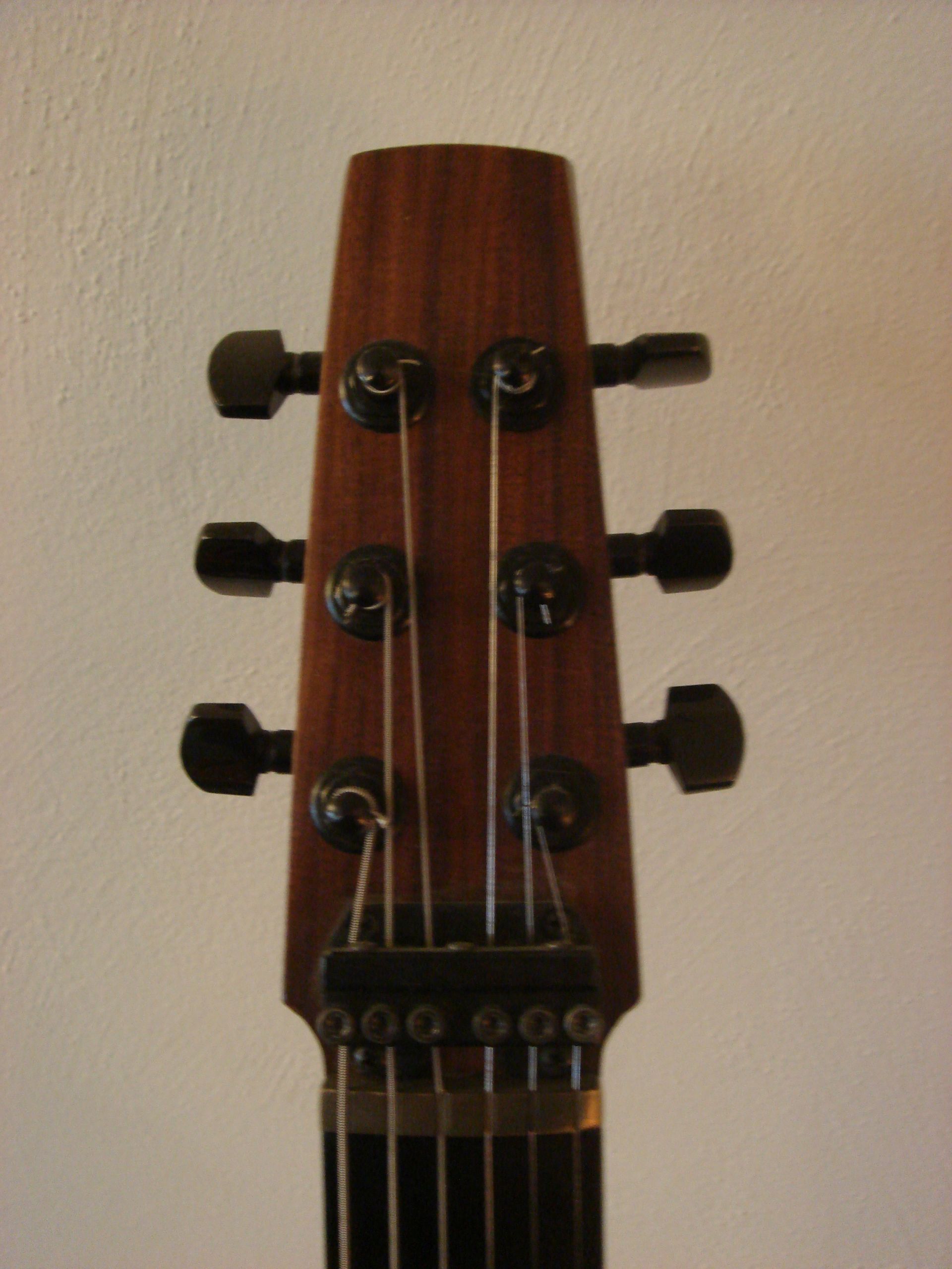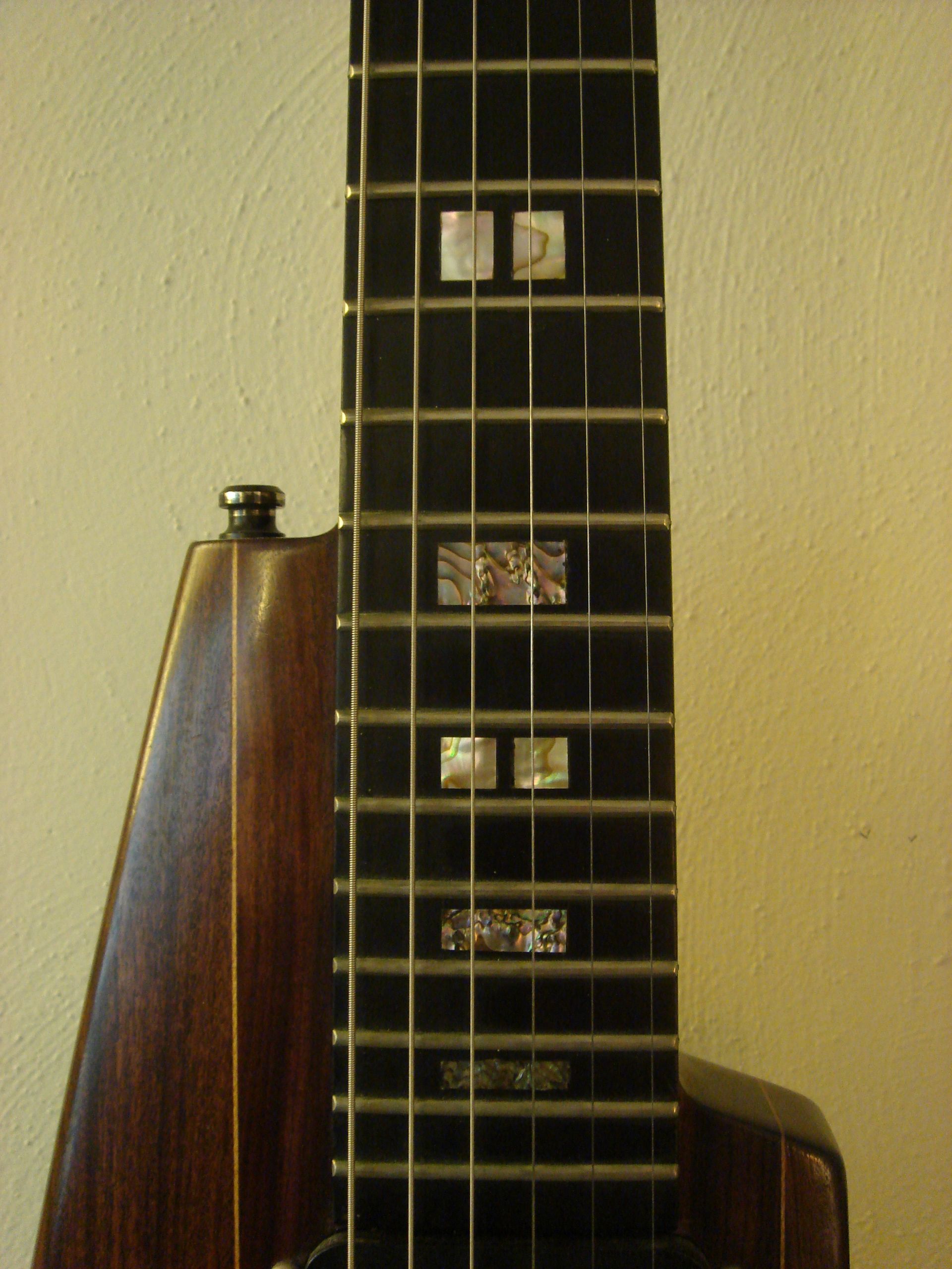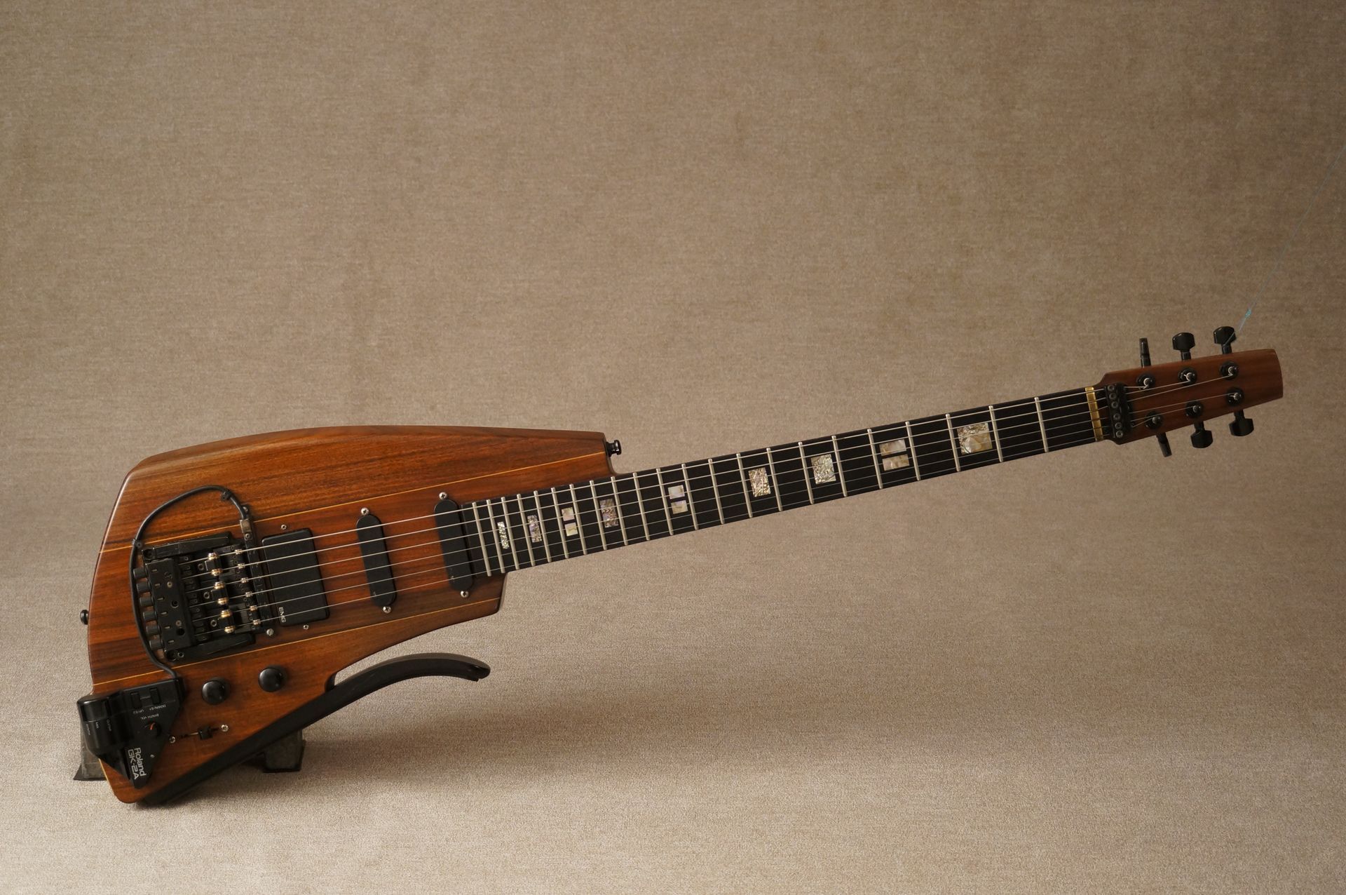 Built from a solid piece of Brazilian rosewood in 1985, the design was created to accommodate the original billet, which was around eighteen inches longer than the guitar. and only as wide as the center section. To build the body, that section was cut off and divided into two wedges, which were then laminated above and below the parallel veneer lines. And once again, form follows function and, in this case, material limits.