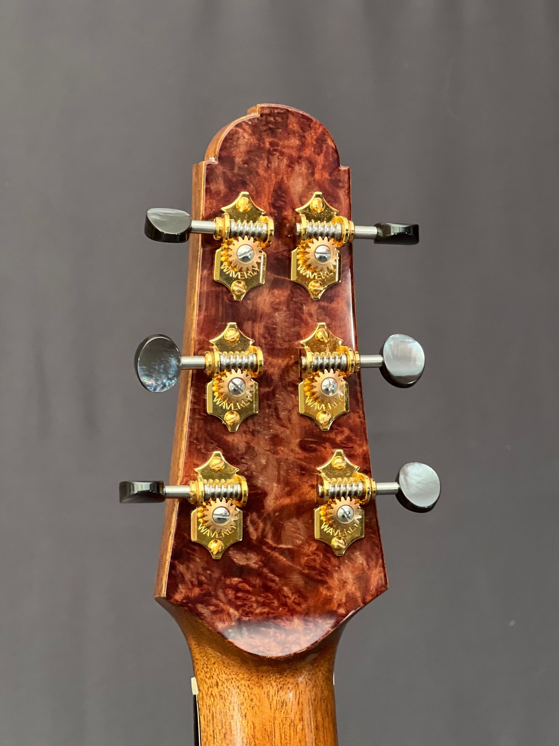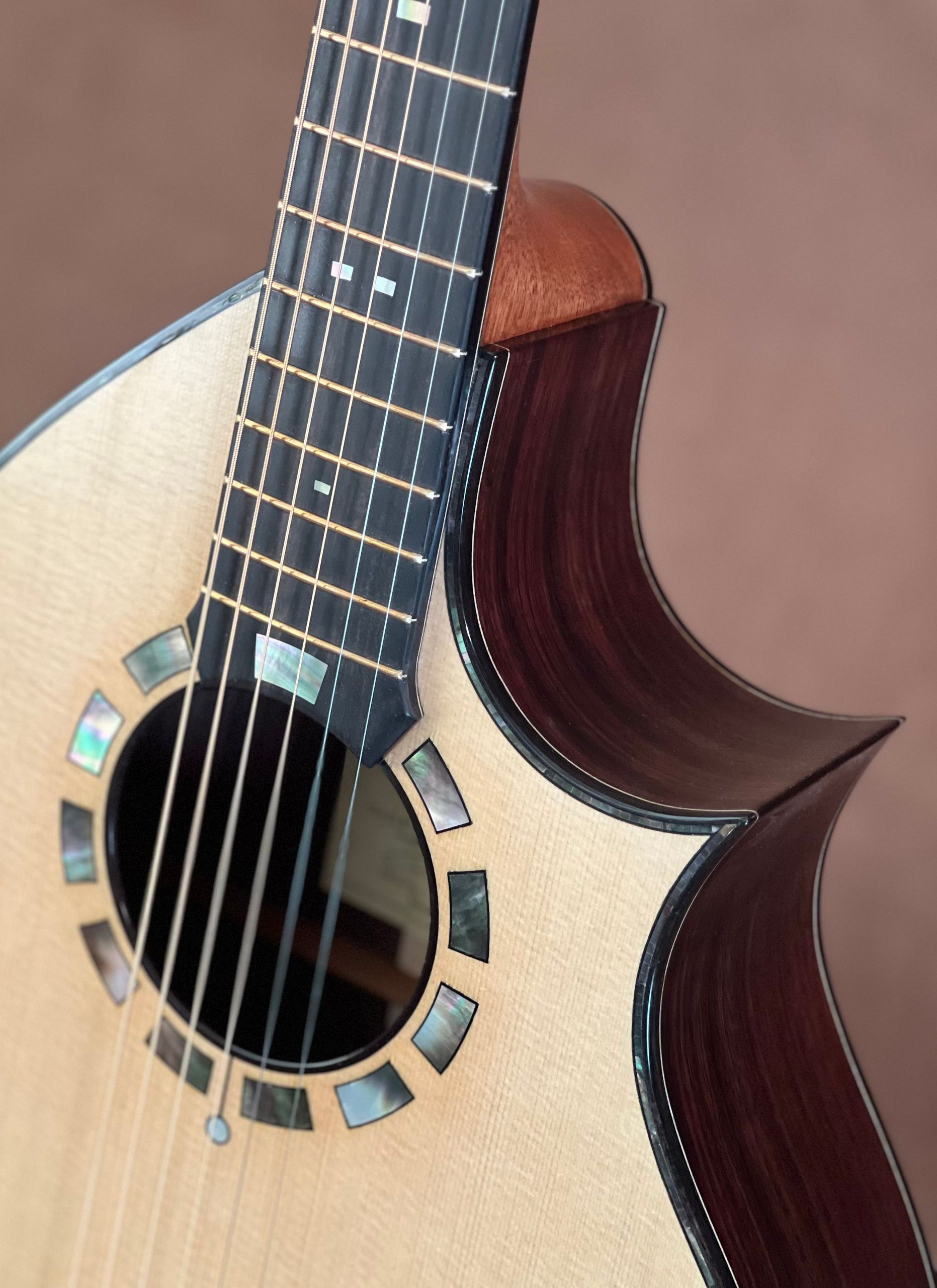Matt Thomas did a demo of the Luthara (just below here). He's an incredible player, creative composer, and engaging performer. For his demos he uses the best mic in the world—extremely sensitive—picking up all the guitar's nuances. The EQ in this recording is flat, so there is a faithful reproduction of the actual timbre of the instrument. This video is best listened to on good speakers. There's an interesting symbiosis between a handmade guitar and a player like Matt. It's pretty obvious when you hear the timbre of the guitar drawn out to its optimal level by a seasoned touch. Matt's won several national finger-picking competitions, demoed in national conventions, and played many of the best boutique guitars in the world.