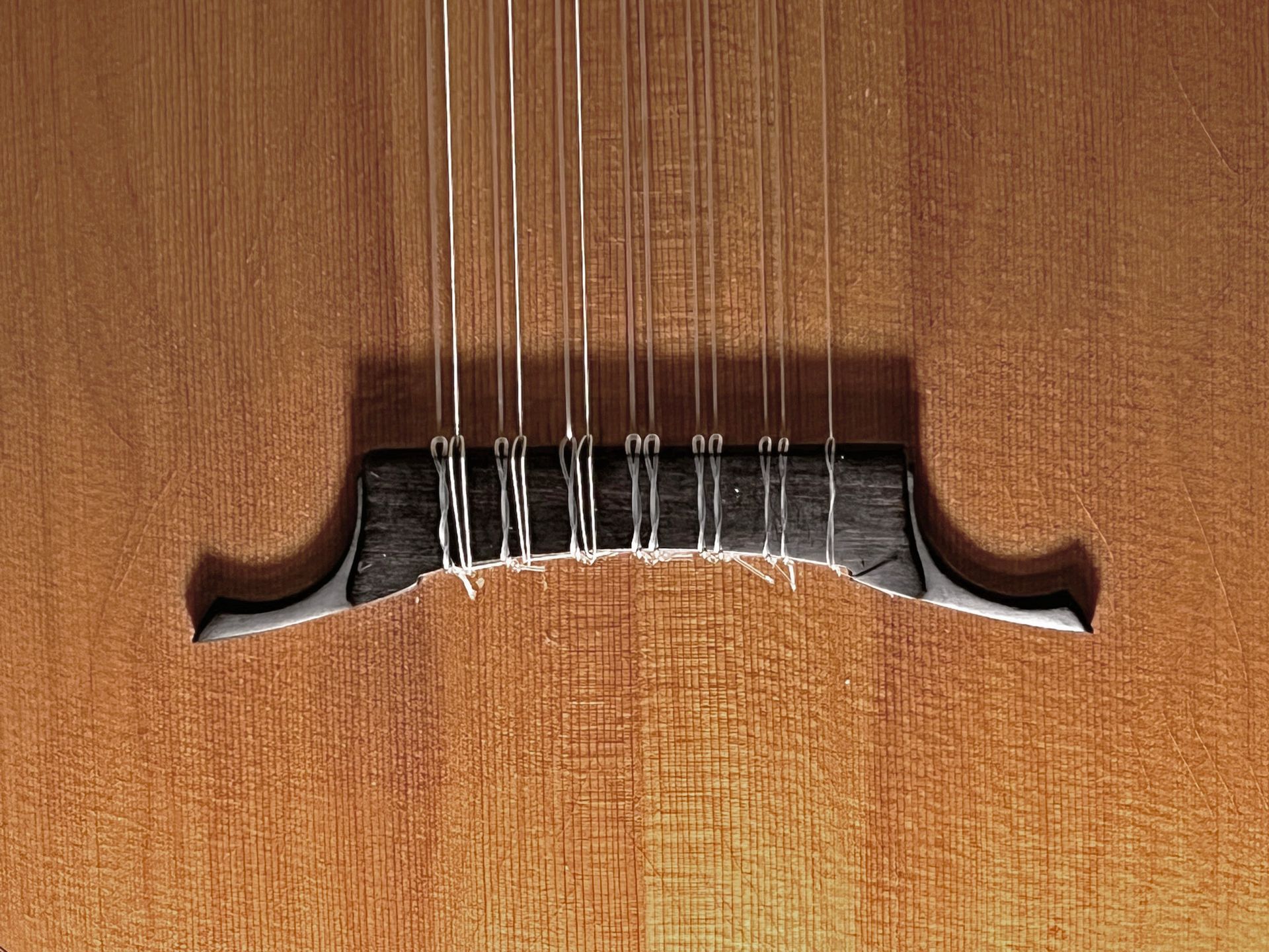 ButtonThe area carved into the soundhole is referred to as a "rose", in lute terminology. My challenge in designing this was to integrate a fourfold (cross) and a sixfold (star of David) geometric symetry in the design of the "knot". There is another well-known lute rose, named the "The Knot of Leonardo."