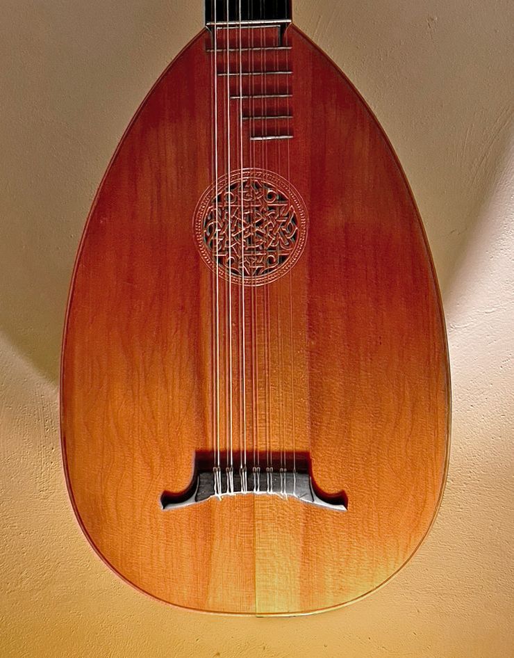 ButtonThe area carved into the soundhole is referred to as a "rose", in lute terminology. My challenge in designing this was to integrate a fourfold (cross) and a sixfold (star of David) geometric symetry in the design of the "knot". There is another well-known lute rose, named the "The Knot of Leonardo."